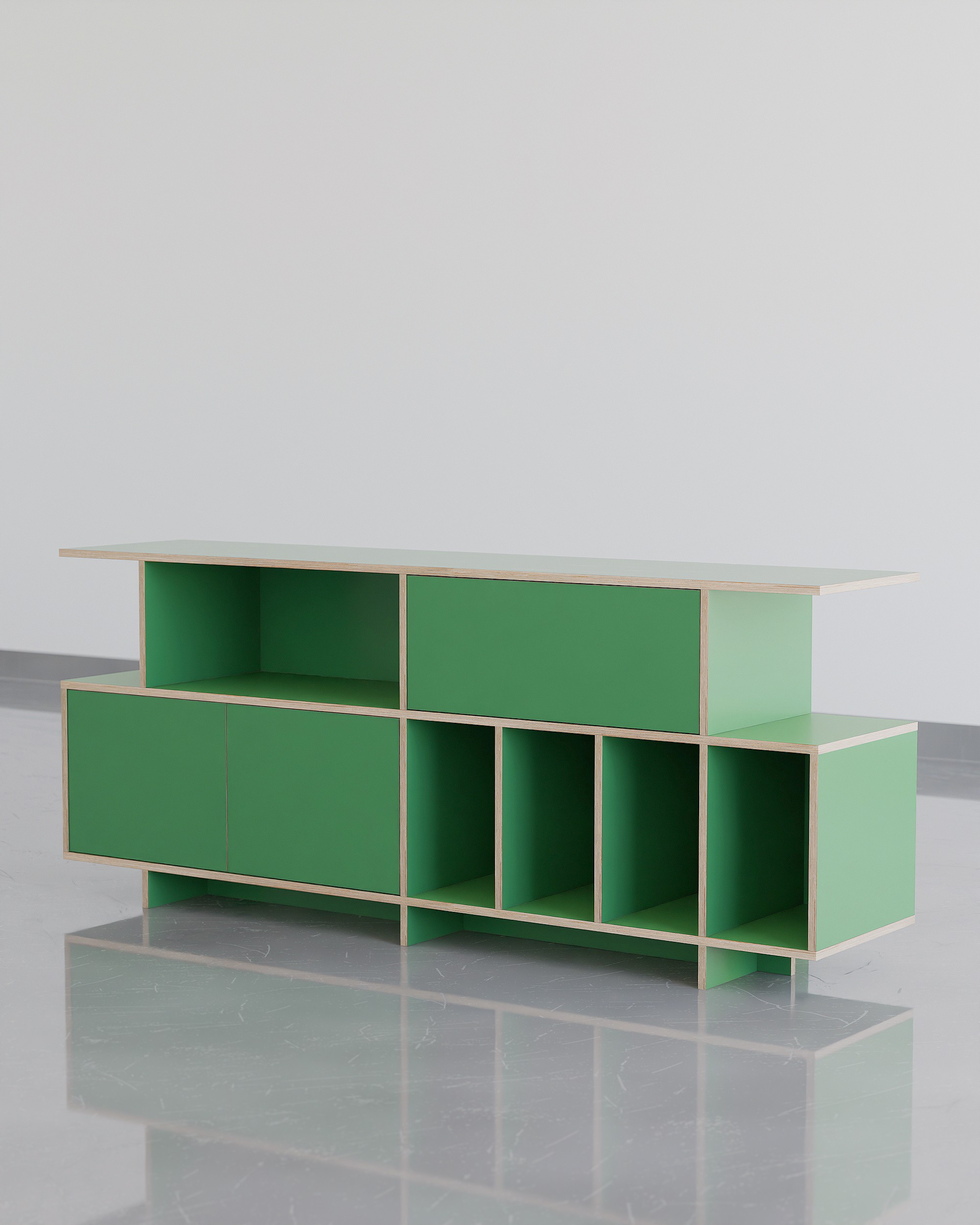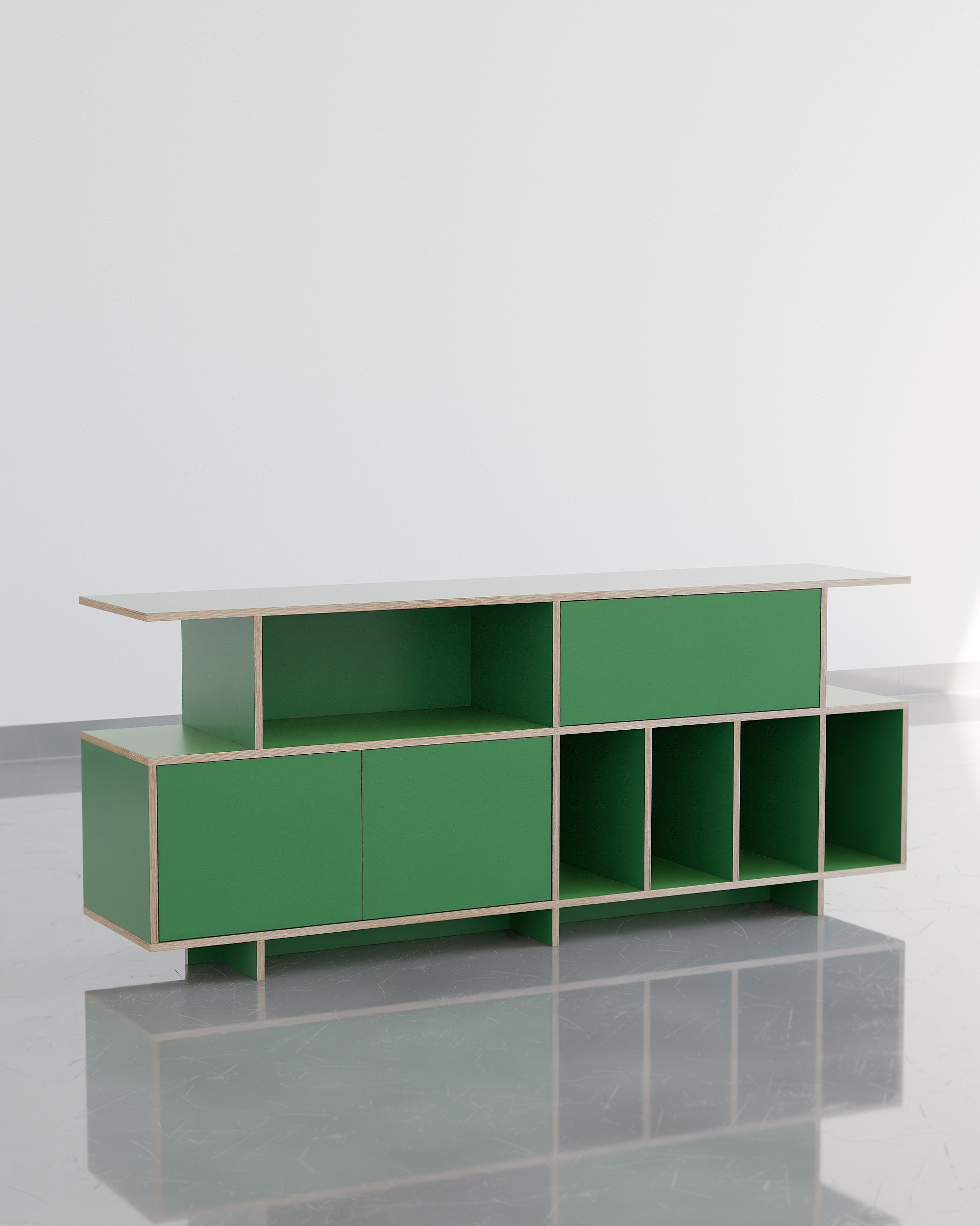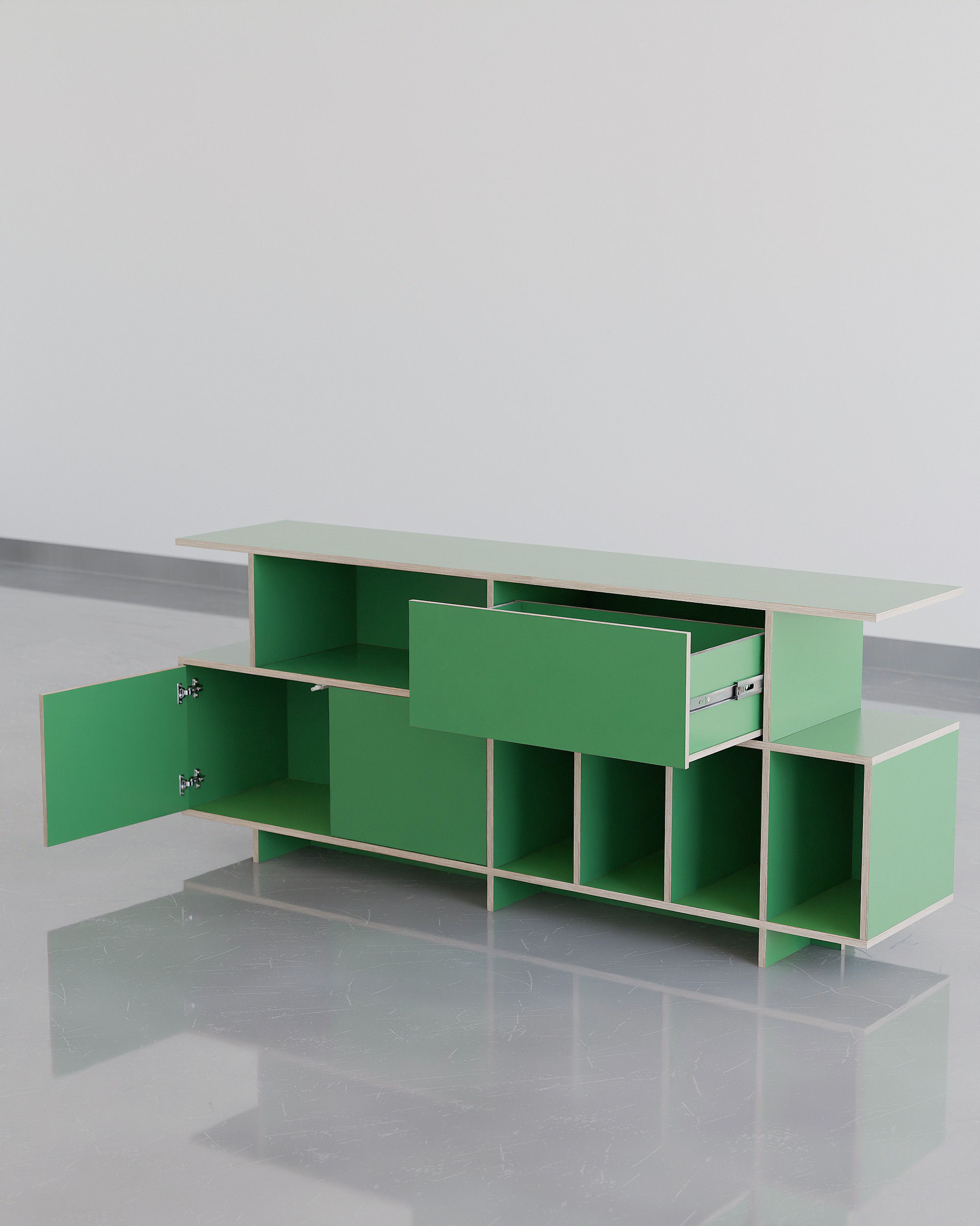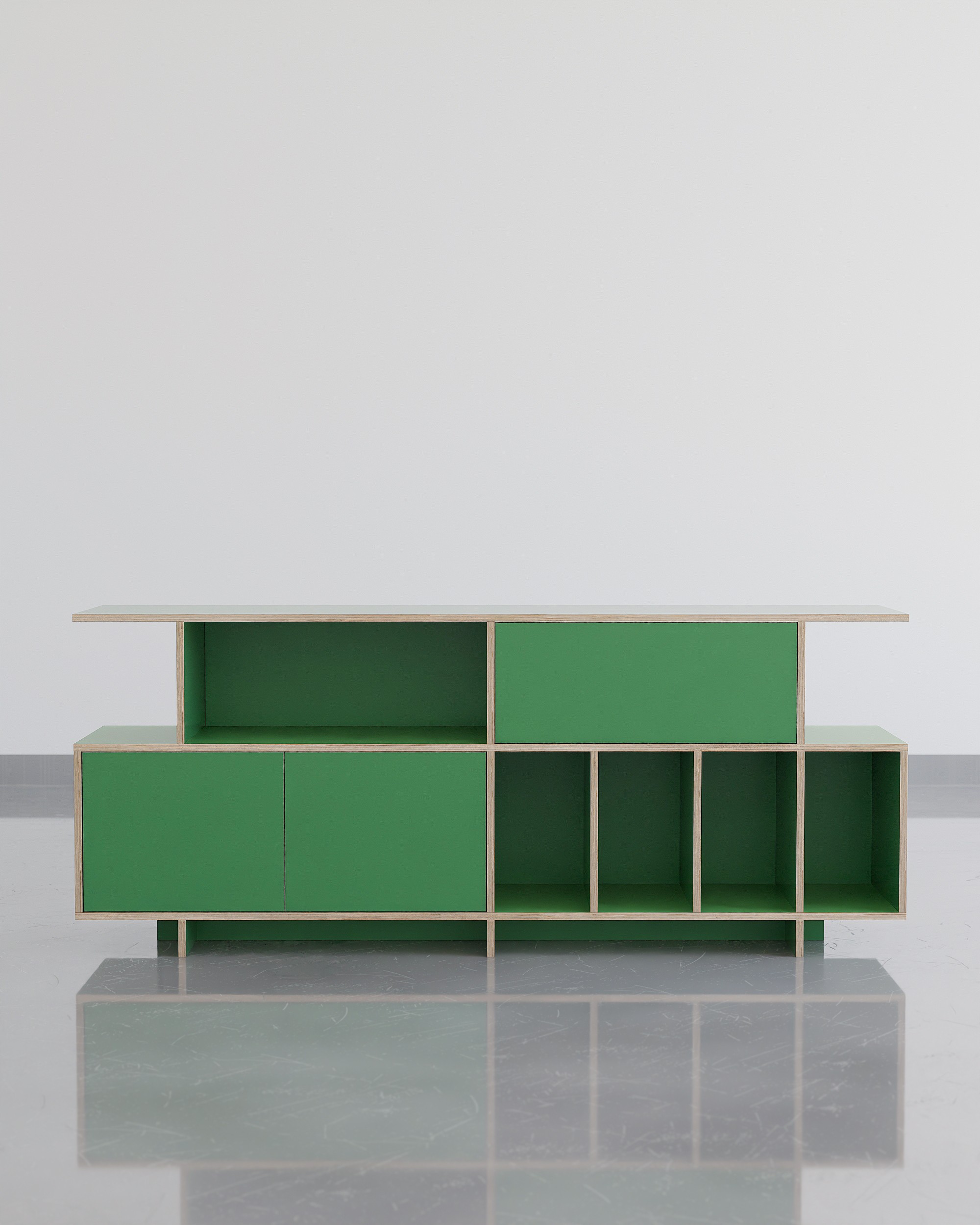 공간의 포인트, 무게감 있는 디자인으로 공간에 중심을 잡아줄 수 있는 사이드보드 타입의 거실장입니다. 수납 옵션으로는 상단부 우측엔 서랍장, 하단 좌측엔 2도어의 여닫이도어가 설치 되어 깔끔한 숨김 수납을 충분히 할 수 있고 내경 370mm 깊이의 책장칸은 LP까지 넉넉하게 수납 가능합니다. 상단부 좌측의 오픈형 칸은 260mm 높이로 (상담을 통해) 케이블 홀 타공을 추가하여 CD 플레이어, 오디오 등을 수납 할 수 있으며 제품의 상판은 가로 1800mm의 넓이와 400mm의 사이즈의 통판으로 중간에 끊어짐 없이 넓고 쾌적하게 사용 가능합니다. 제품은 맞춤 제작 서비스를 통해 공간에 맞는 컬러, 사이즈, 칸 구성을 변경 할 수 있습니다.