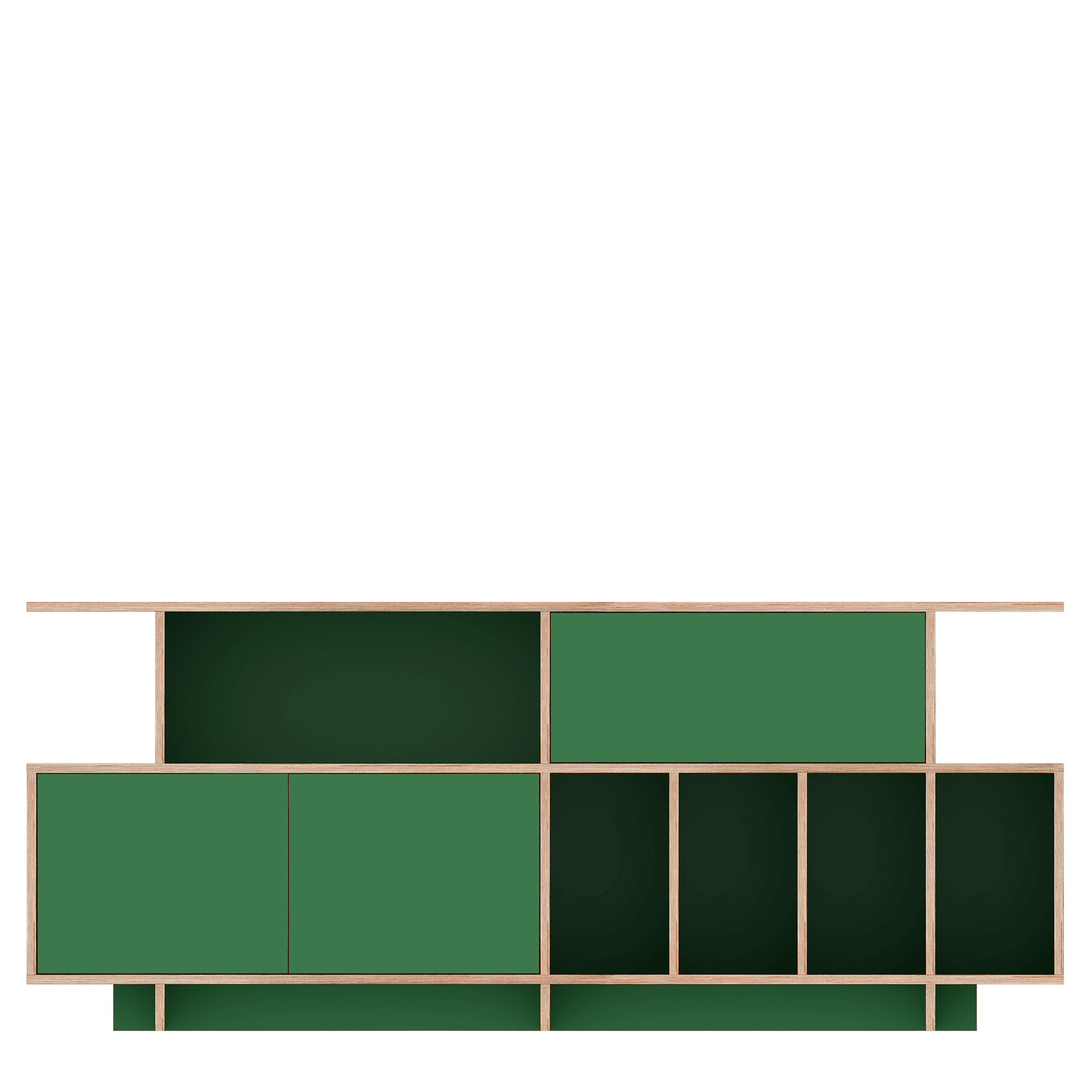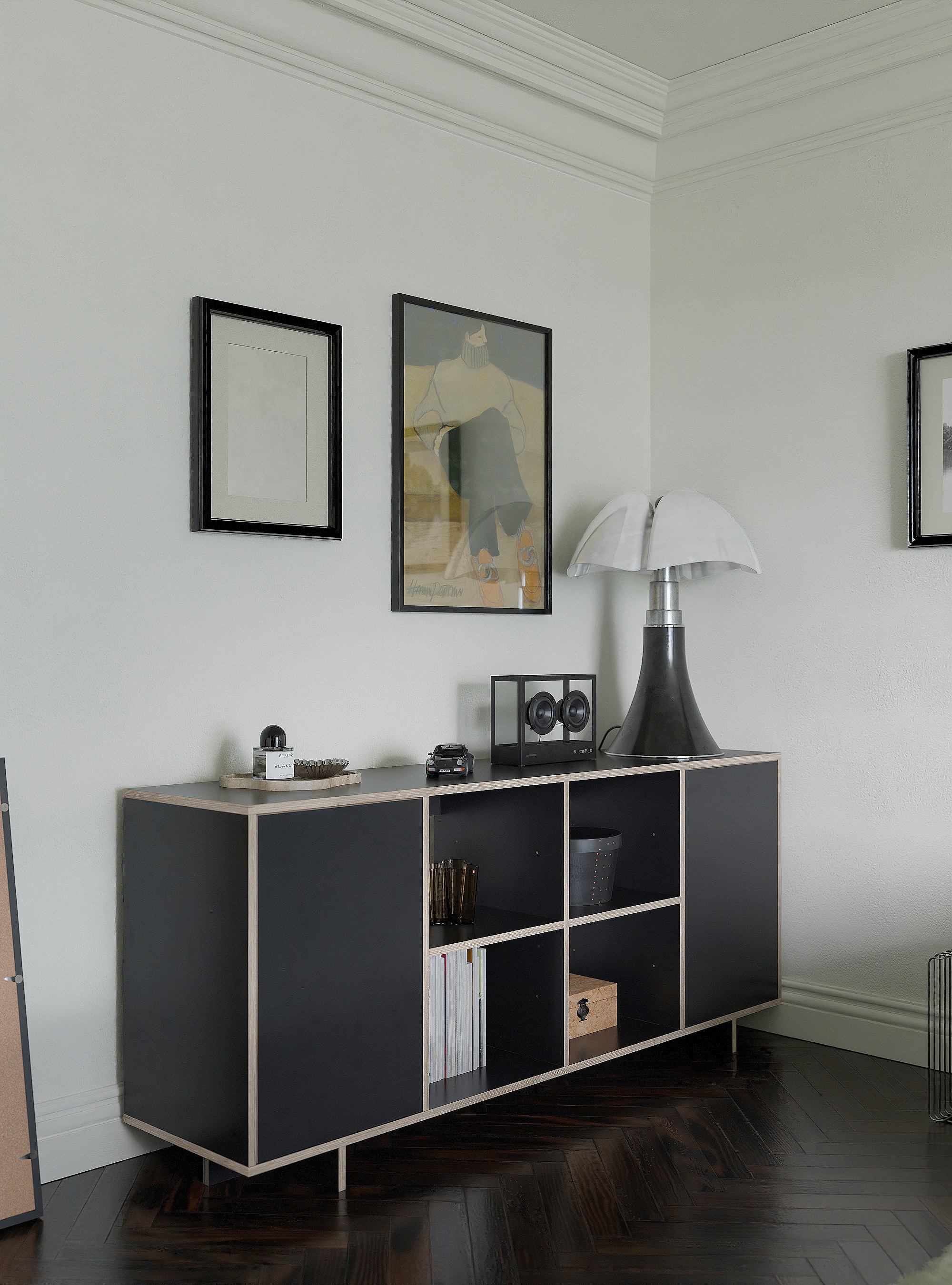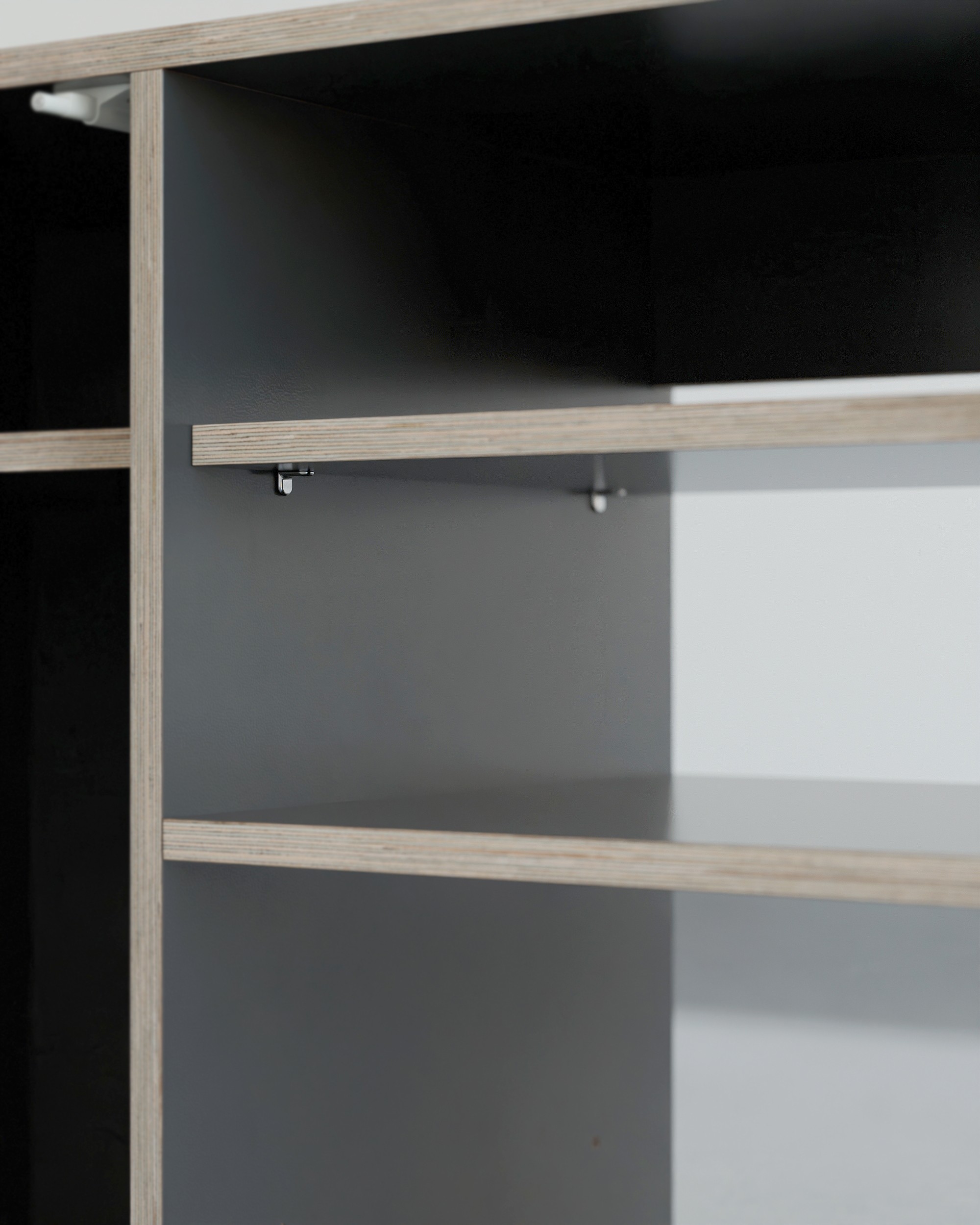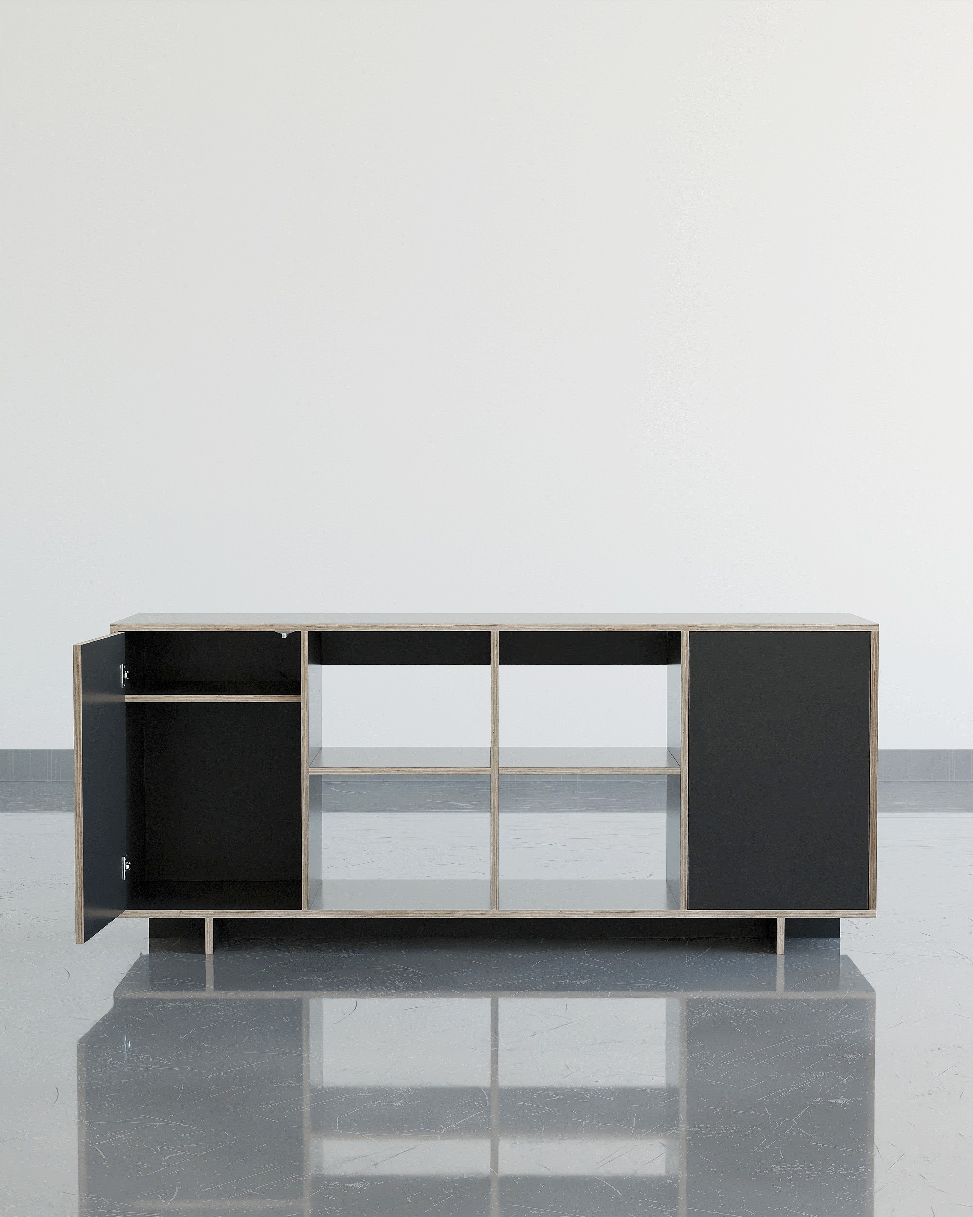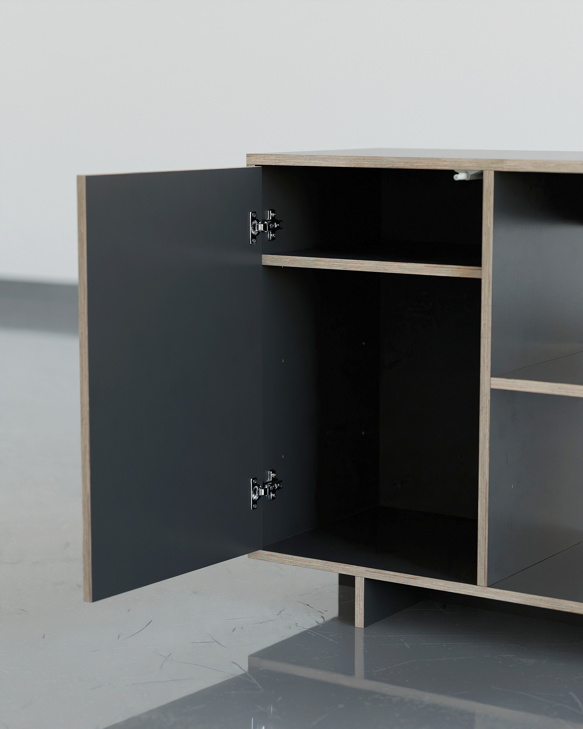 심플하고 미니멀한 디자인과 하단부 다리 디자인이 포인트인 사이드보드 타입의 캐비넷입니다. 공간에 중심을 잡아주기 좋은 크기와 디자인으로 중앙 책장칸 후면은 오픈된 형태로 (막힌 디자인으로 변경 가능) 서적은 물론 전자기기들을 수납하기 좋습니다. 푸시 도어가 설치된 좌, 우칸 내부는 높이 조절 선반을 활용하여 수납목적에 맞게 칸의 높이를 총 4가지로 조절 할 수 있으며 높이 조절 선반은 중앙 책장 칸에도 설치하여 사용 할 수 있습니다. 총 넓이 1600 깊이400의 길고 넓은 상판으로 다양한 활동 및 장식품, 턴테이블, 커피머신 등을 커버 할 수 있고 책상보다 조금 낮은 715mm의 높이로 간단한 작업 등이 가능합니다. 제품은 맞춤 제작 서비스를 통해 공간에 맞는 컬러, 사이즈, 칸 구성을 변경 할 수 있습니다.